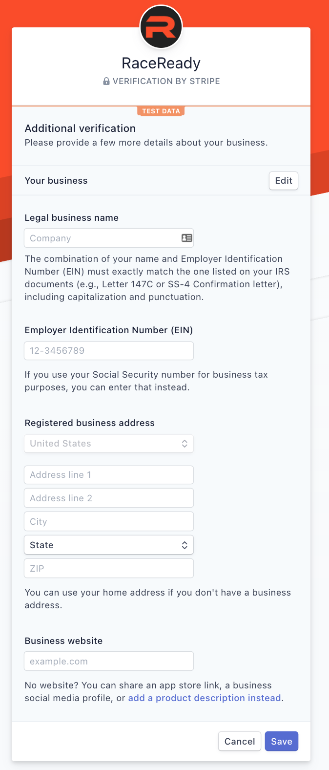Once all sections are completed, click "Submit" and Stripe will process your application and connect your account. it will also re-route you back to your RaceReady account.